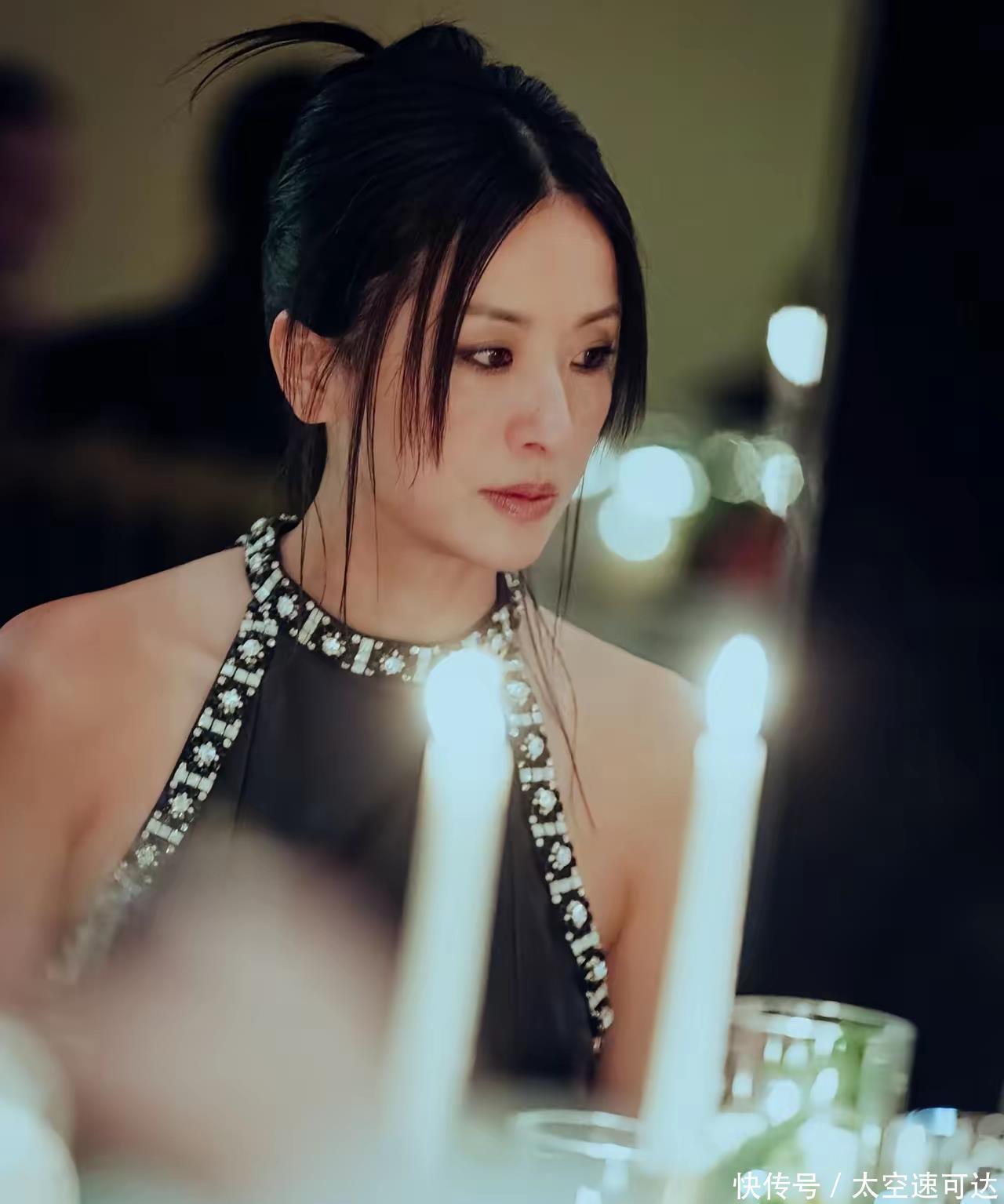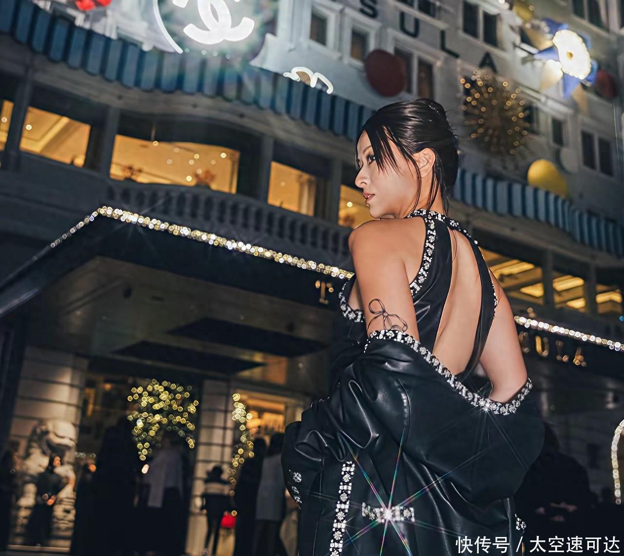 一头挽起来的长发加上额头两旁的刘海,显得既很成熟有女人味,一条黑色的礼服大秀美背,小麦色的肤色显岁的徐濠萦健康又气场强大。